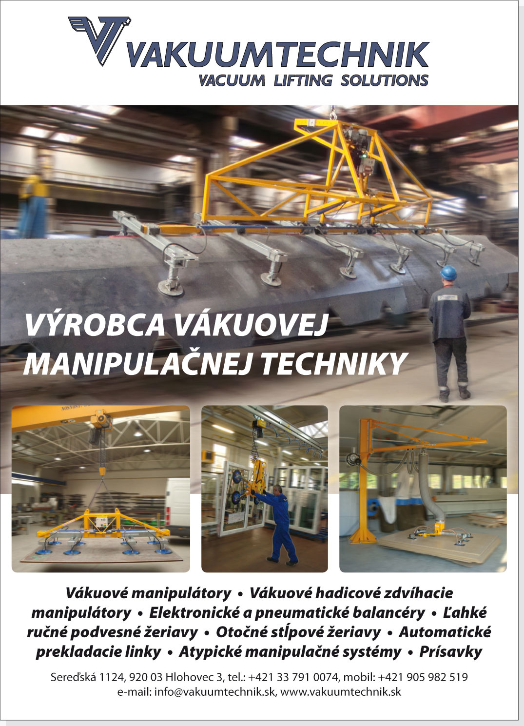 Spoločnosť VAKUUMTECHNIK, s.r.o., so sídlom v Hlohovci, patrí medzi popredných výrobcov a dodávateľov špecializovanej vákuovej manipulačnej techniky na Slovensku a v Českej republike. Jej hlavným zameraním je poskytovanie komplexných riešení pre bezpečné, efektívne a ergonomické zdvíhanie a premiestňovanie ťažkých či rozmerných bremien v rôznych priemyselných odvetviach.